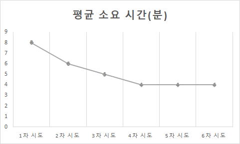첫 번째 시도에서는 8분, 두 번째에서는 7분, 세 번째에서는 5분, 그리고 네 번째에서는 4분이 걸렸군요. 이렇게 학습 곡선을 통해서 사용자가 충분한 학습 상태, 즉 프로그램을 능숙하게 사용할 수 있는 상태에 도달하기까지 시간이 얼마나 걸렸는지 알아내는 것입니다.