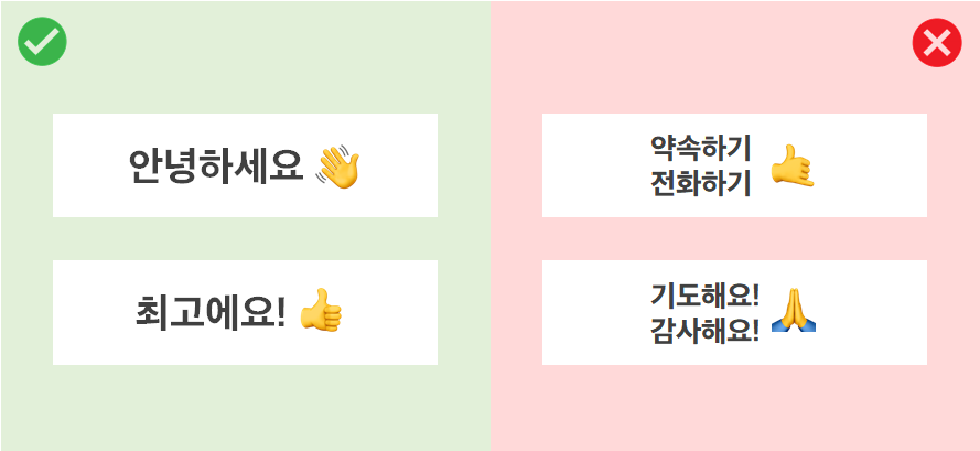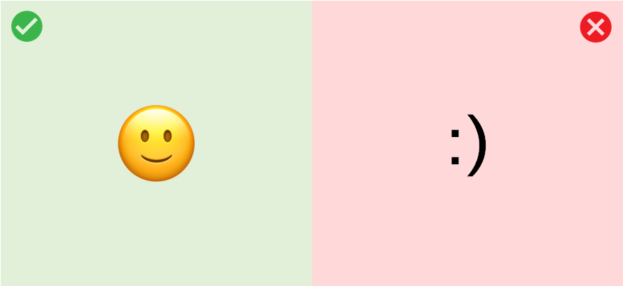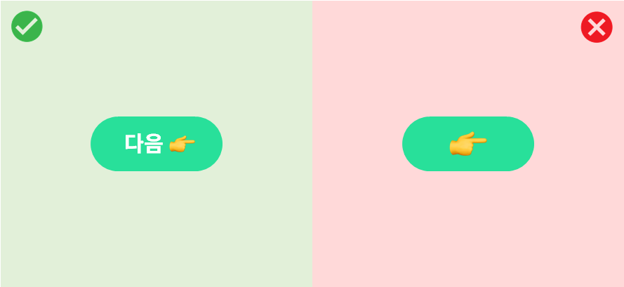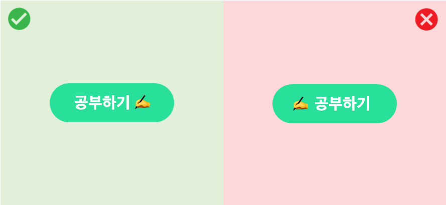 1번과 마찬가지 의미이지만 항상 텍스트가 우선시되어야 합니다. 사람들은 전달하고자 하는 메시지를 먼저 접하길 원해서 텍스트 이전에 이모지가 있다면 오히려 메시지 전달받는 과정을 해칠 수 있습니다. 디자인 컴포넌트에 이모지를 활용하는 건 좋지만 텍스트보다 앞에 배치한다면, 읽는 이가 이를 인지하는데 로드를 부여하게 됩니다. 이모지는 아이콘과는 분명히 역할이 다르기 때문에 꼭 구별해서 사용해야 합니다.