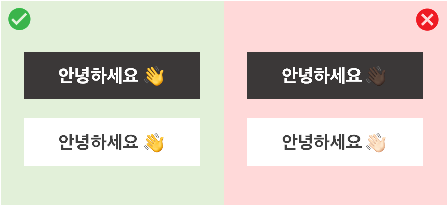 배경의 밝기에 따라 이모지가 제대로 보이지 않을 수 있습니다. 같은 의미의 여로 종류의 이미지를 전부 배경색과 비교해보고 선택하는 것이 좋습니다. ('자동차' 의미를 가진 이모지는 10가지가 넘습니다.) 피부색은 어두운 배경과 밝은 배경 모두에서 대조적으로 보이는 기본색인 노란색을 사용하는 것을 추천드립니다.