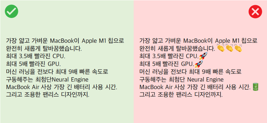 텍스트에 이모지를 포함시키고자 할 때 또 기억해야 하는 것이 있습니다. 메시지를 읽는 사람은 이모지를 해석하고 받아들이기 위해 신경을 써야 한다는 점입니다. 그래서 이모지가 여러 개 사용되고 반복되어 사용된다면 가독성을 떨어뜨리게 됩니다. 예를 들어, "탈바꿈했습니다. 박수. 박수. 박수."와 같이 머릿속에서 이모지를 읽고 받아들이기 위한 시간이 필요합니다. 과도한 이모지 사용은 전체적인 메시지를 이해하는 시간을 늦출 수 있으니 주의해야 합니다.