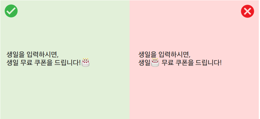 단어와 마찬가지로 문장에서도 꾸미는 역할만 하도록 하는 것이 좋습니다. 이모지가 문장 중간에 배치되어있다면 이모지가 문장에서 텍스트를 대신하는 것으로 읽힐 수 있어, 문장을 이해하기 오히려 힘들어질 수 있다. 예를 들어, "생일을 입력하시면 생일(케이크) 무료 쿠폰을 드립니다!"로 읽히게 되는 것입니다. 하지만 이모지가 문장 끝에서 꾸미는 역할을 한다면, 문장에서 전달하고자 하는 내용을 더 각인시키고 감정을 강화하여 전달할 수 있습니다.