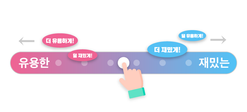 유용한 서비스와 흥미로운 서비스는 서로 상반되는 특징을 가집니다. 이러한 연속적인 축 위에 서비스는 존재합니다. 따라서, 마치 줄다리기를 하듯, 유용함이 떨어지는 서비스는 '비교적' 흥미로움이 강조 되는 것이죠!