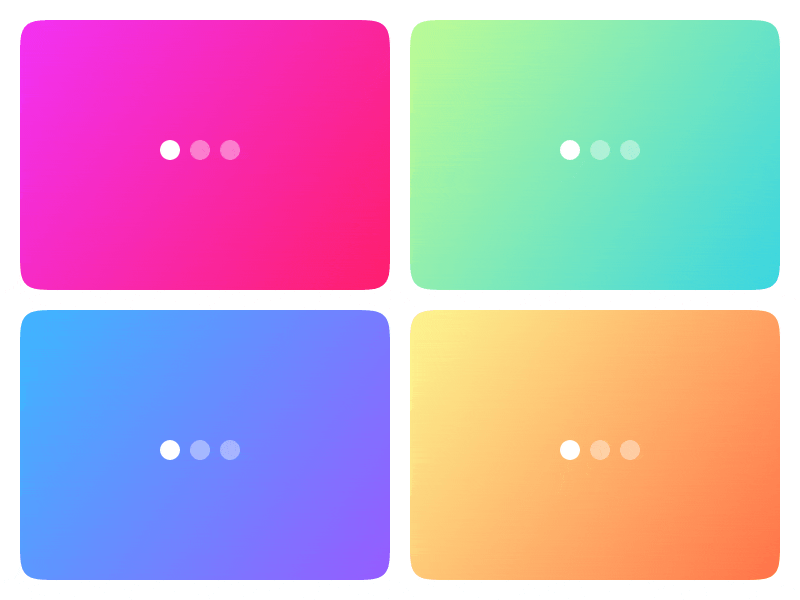 페이지 인디케이터 예시입니다. 빨강과 초록의 경우 인터랙션이 조금 과하여 즉각적으로 확인할 수 없는 점이 걸리네요. 파랑색의 경우 페이지 이동이 직관적이지 않고 페이지 이동이 아닌 다른 상호작용을 한듯한 느낌이 들어요. 이 인디케이터들 중에서는 주황색 예시가 가장 적절해보이네요.