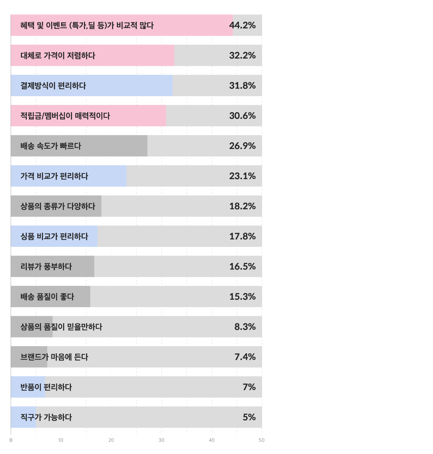 꼽더라구요. 결국 이것들도 가격 차별성이나, 편리한 배송과 연관이 있네요.