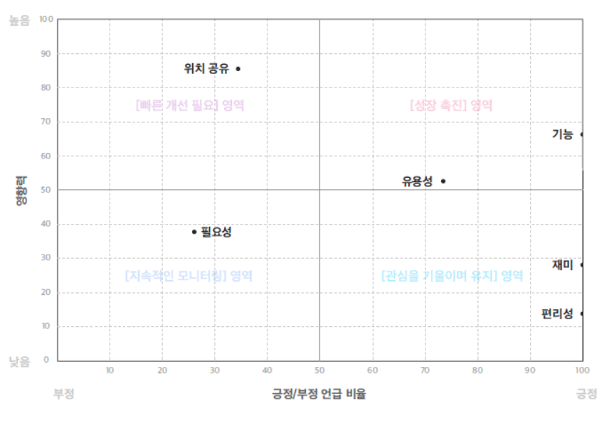 빠른 개선 필요 영역에 해당된 [위치 공유]는 높은 영향력을 가졌으나 부정적으로 언급된 키워드입니다.